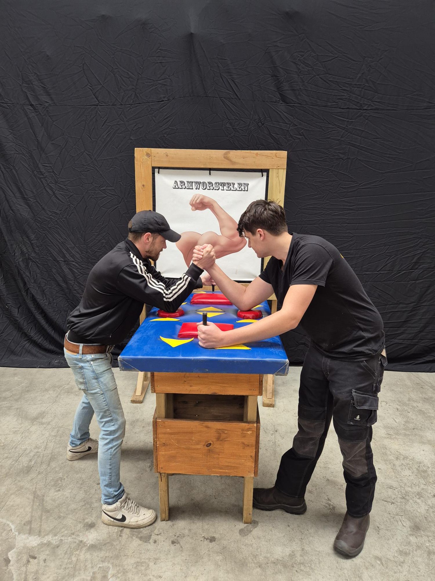 Zoek een tegenstander en zet je eleboog op de tafel, pak de hand van de tegenstander en duwen maar. Wie is het sterkst?