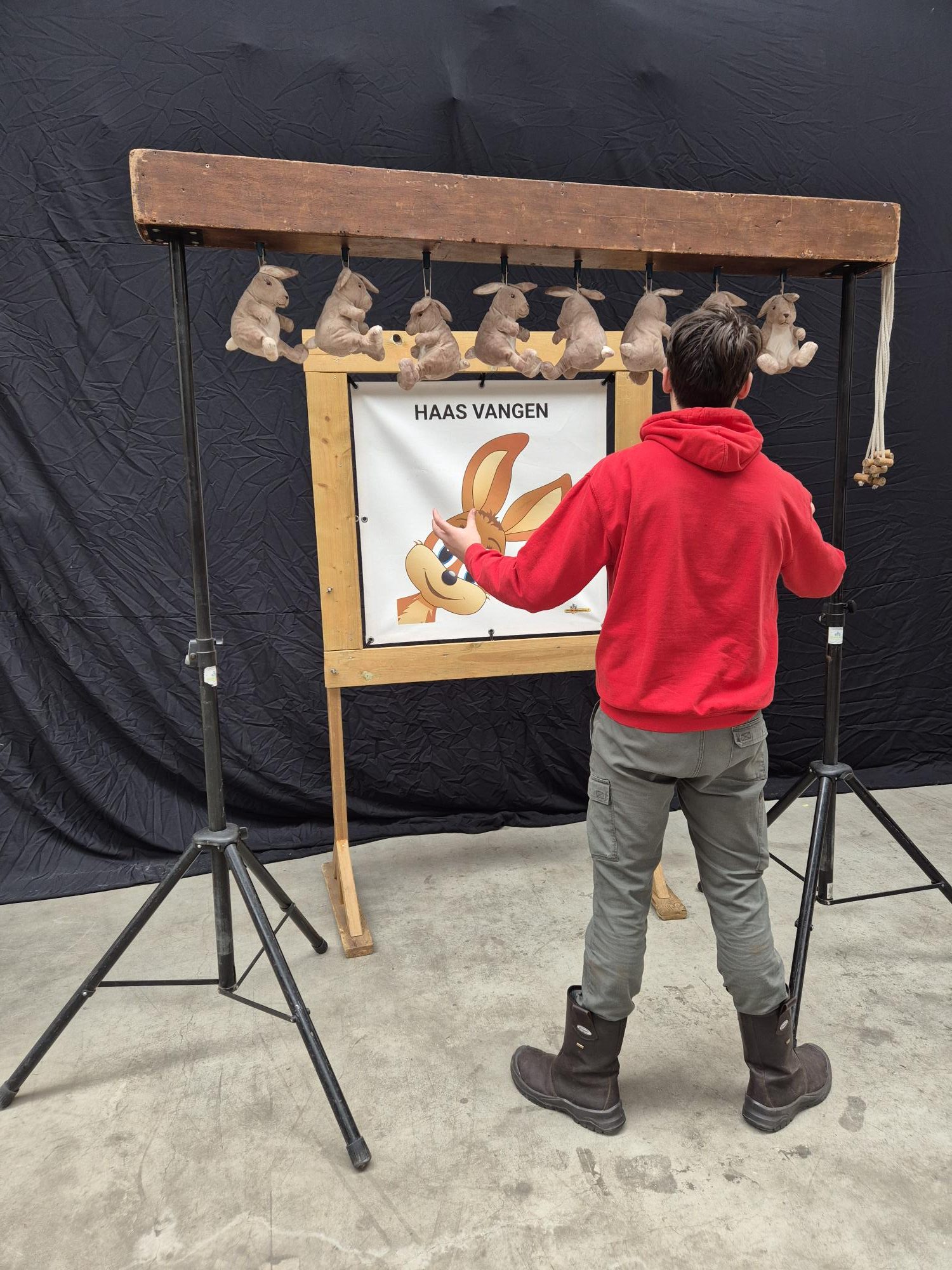 De persoon die het spel bedient trekt steeds aan een touwtje om een haas te laten vallen. Welke? Dat is voor iedereen een vraag.