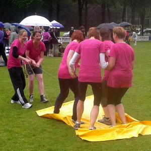 Er gaan 4 mensen op een vliegend tapijt staan. Dit tapijt vliegt uiteraard niet uit zichzelf, 2 teamleden trekken het voort maar dit lukt natuurlijk ook niet. Behalve als de 4 op het tapijt tegelijk omhoog springen. Wie doet dit het best?